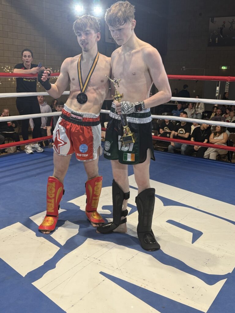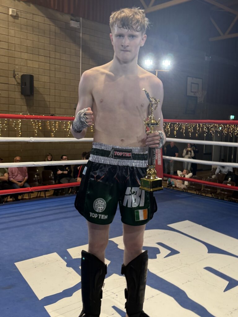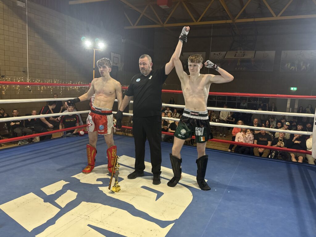 Local kickboxing talent Cayden Derwin delivered an outstanding performance at the TMA Fight Show on Saturday, March 21st, held at Kilnamagh Recreational Centre, securing a unanimous decision victory over Craig Evans of Eagle Martial Arts.